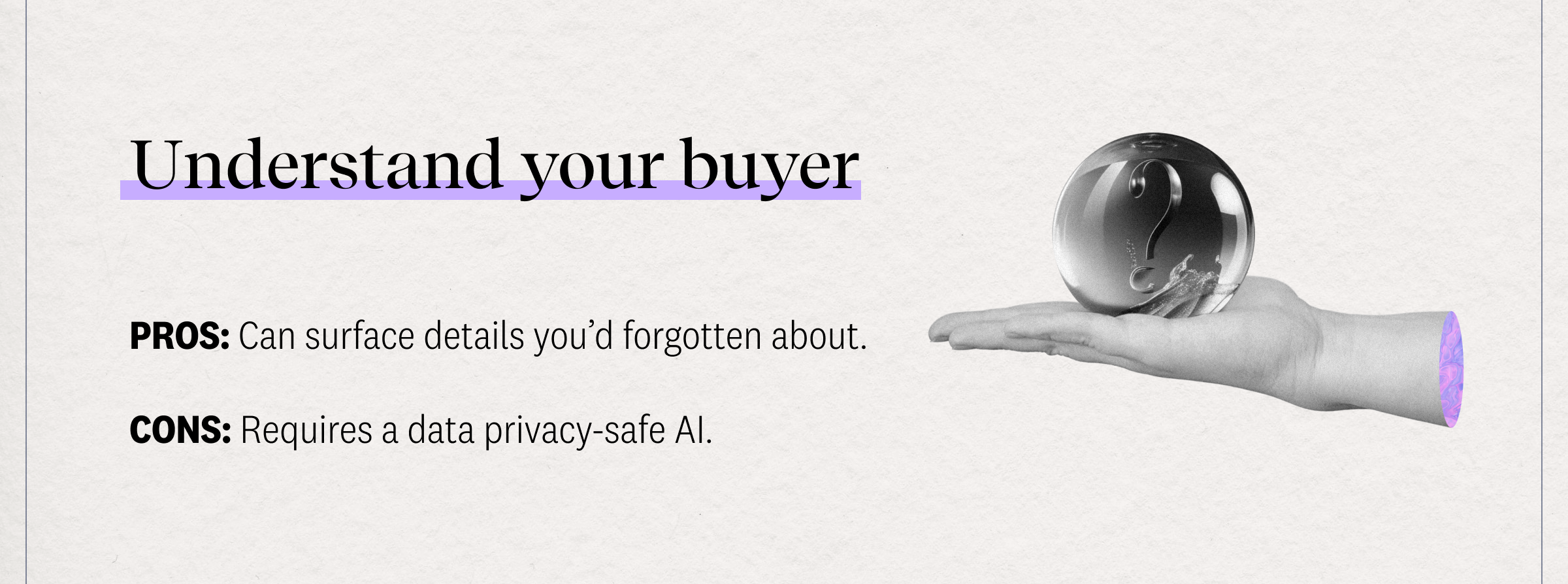 If you have an AI service that’s data privacy safe, have it analyze a corpus of valid information, like recorded sales calls, win/loss analyses, and CRM data.