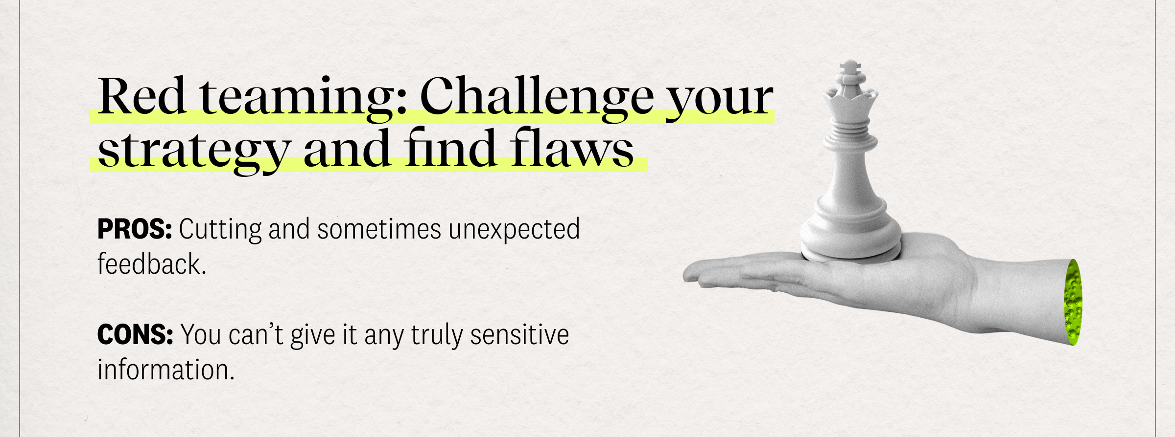 This is the hyper-intelligent tarot card approach: Ask the AI to critique your idea, question your assumptions, and identify things you hadn’t thought of. For example, give it your marketing plan (if it isn’t sensitive) and ask what might go wrong. This beats asking it to generate something from scratch, which is often way off base (AI is good at probabilistic generalities and iteration, not deterministic specifics and creation).