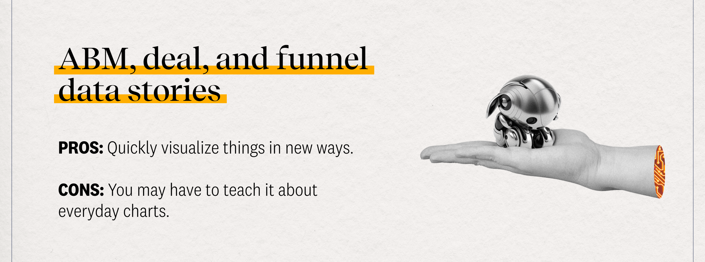 The stories we tell ourselves about buyers tend to be fuzzy. They’re a bit of a Rorschach test for revenue teams—everyone sees something different. That’s because they're always based on speculation and we humans aren’t great at deciphering data. We do excel at asking questions and telling stories, though, and we’re finding that clients can use AI to analyze their ABM and funnel data for those teams to tell stories around.
