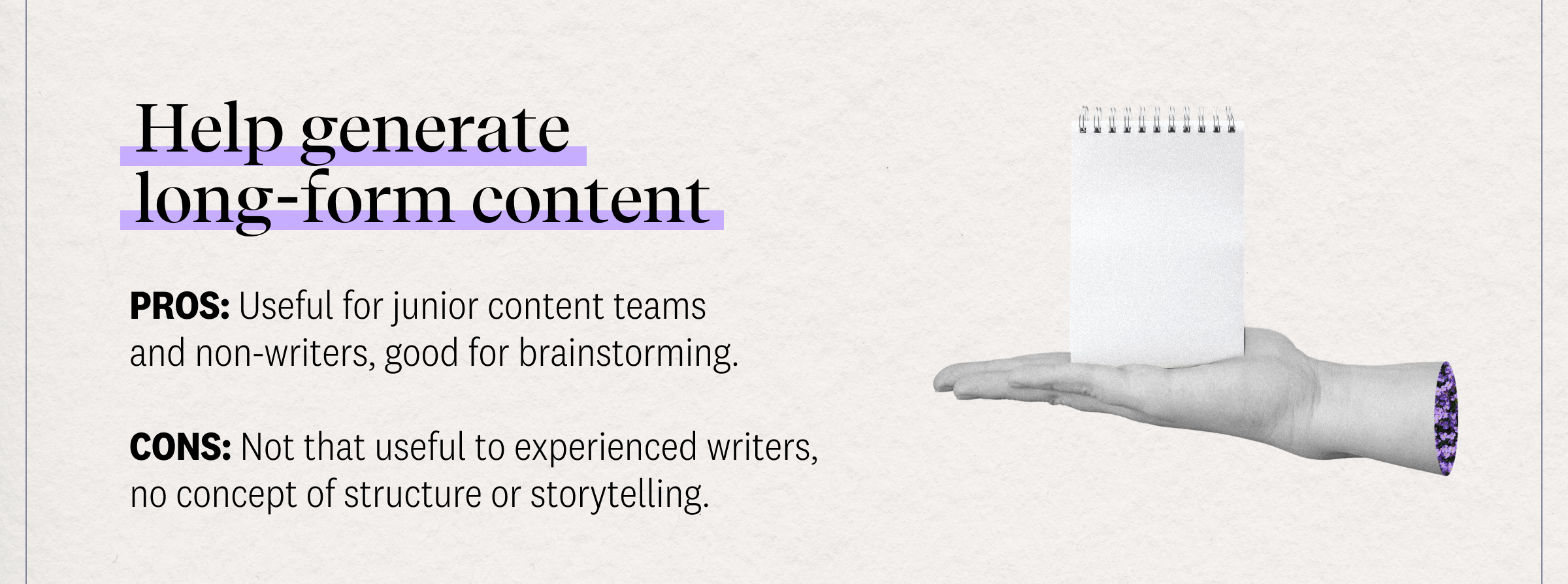 Full disclosure, Fenwick has not applied this in our own work because the technology is not there yet. It is most effectively applied to help junior content teams perform more like mid-level. Many of the benefits, like brainstorming and helping writers overcome blank page paralysis, aren’t useful to experienced writers. Nor does it speed up research, because good writers don’t want an average of all answers available in the training data—they want one good one, clearly staged from a credible source. This means it’s faster to go to Harvard Business Review or Bain.com than trace the AI’s best guesses back to their source.