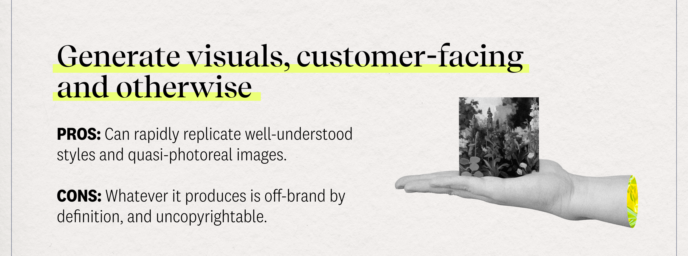 There are many caveats. One, achieving a precise prompt requires a designer with enough experience to know what a Freisian style is, for example, and whether it’s the style you want, and if Midjourney has achieved it. Two, these images are off-brand (by definition; they are derivatives) and not copyrightable. Three, they’re very difficult to keep within a style of your choice and consistent. You have to find a style Midjourney knows and can replicate. Which in many cases, is a worse alternative to having an artist create something that genuinely matches your brand.