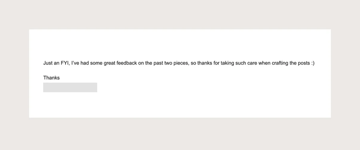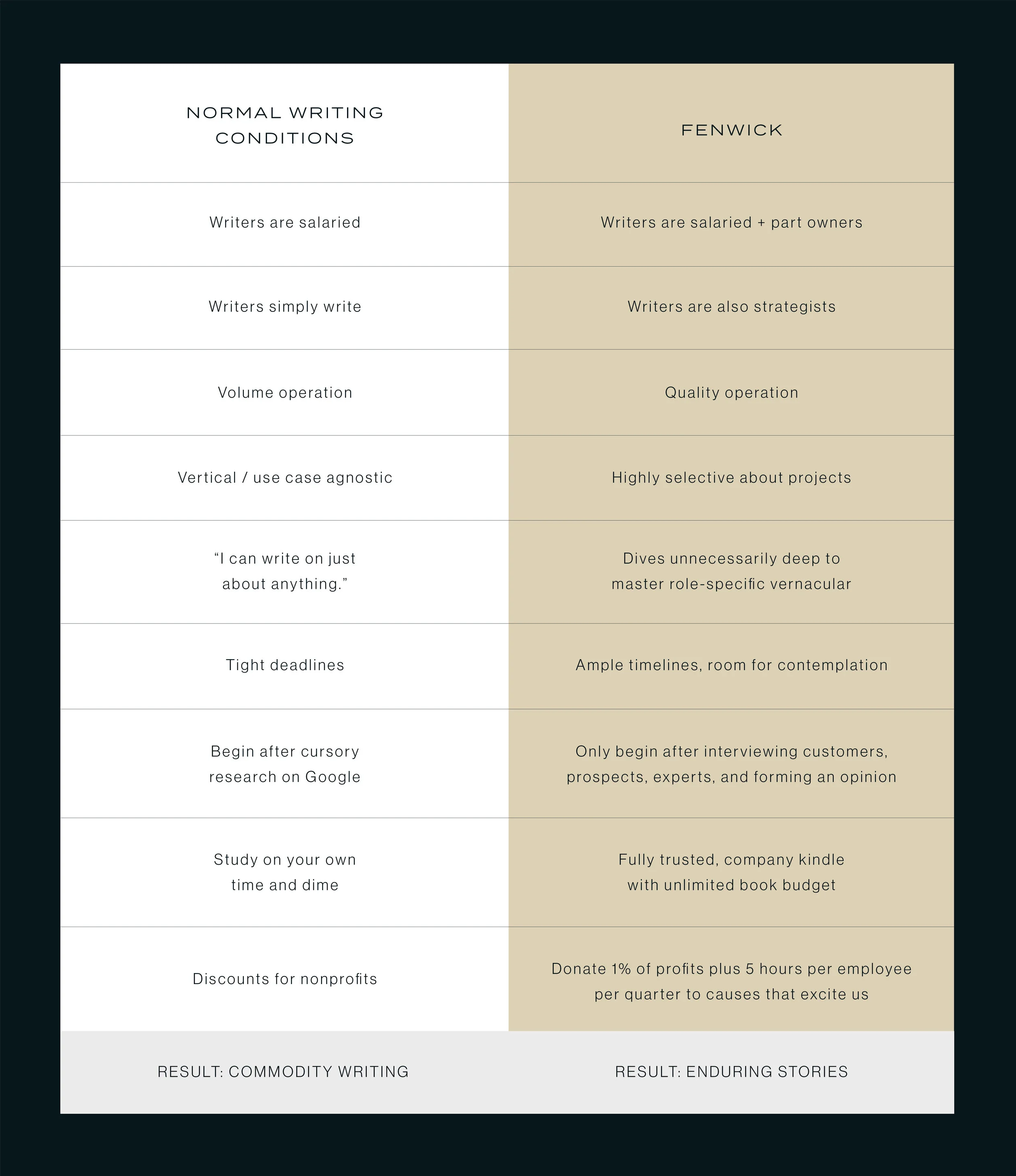 I’m thrilled by the cohesion. I’m invigorated by our team's refined purpose. And I’m excited to see where we are in five year’s time. My hope is that Fenwick will produce a more perfect method for writing and design in business—one that helps companies stand out, speak up, and give back by being more thoughtful in their communication.